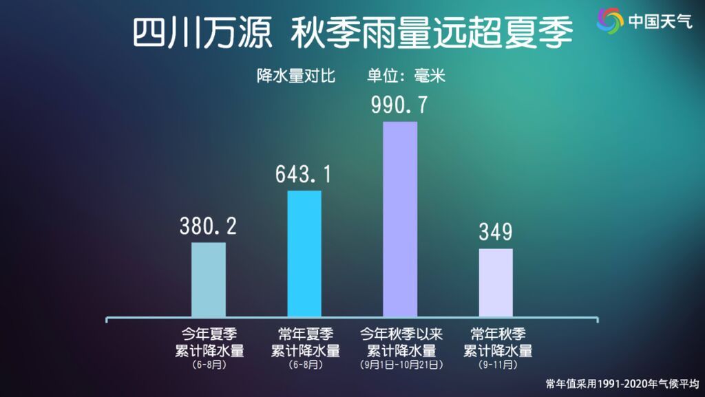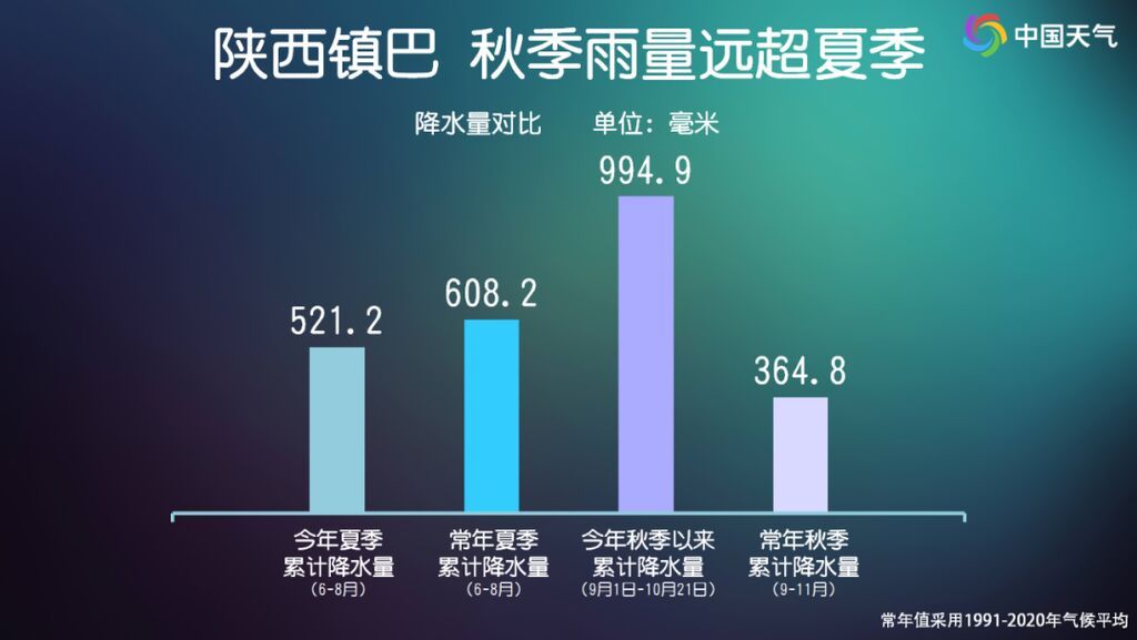 其中陕西镇巴、四川万源,9月1日至10月21日累计雨量接近1000毫米,均大幅超过当地今年夏季和常年夏季的降水量,而且也超过2021年秋季的降水量,提前锁定最多雨的秋季。