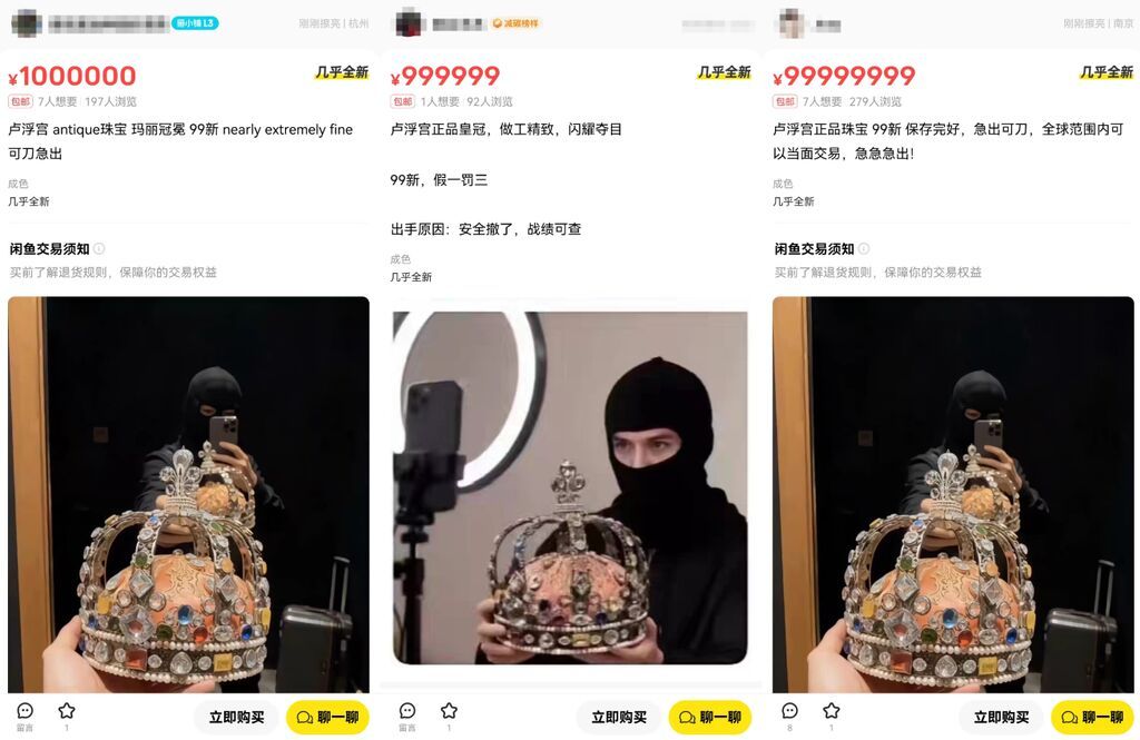 “卢浮宫正品珠宝,急出可刀,全球范围内可以当面交易……”近日,有网友发现,在二手交易平台咸鱼上,多个链接号称出售此前在卢浮宫失窃的珠宝。10月19日,法国巴黎卢浮宫开馆时发生一起持械抢劫事件,报道称数名蒙面嫌犯闯入巴黎卢浮宫,盗走多件藏品。