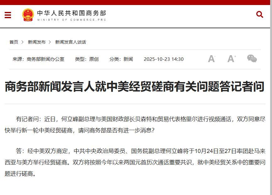 有记者问:近日,何立峰副总理与美国财政部长贝森特和贸易代表格里尔进行视频通话,双方同意尽快举行新一轮中美经贸磋商,请问商务部是否有进一步消息?