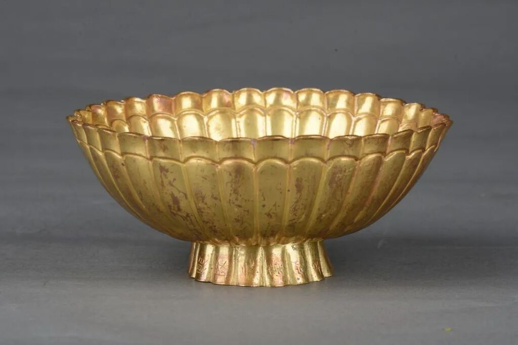 在彭州市博物馆的展柜中,这对瓜形金盏虽历经八百年尘封,依旧泛着温润的金光。它们并非规整的几何造型,而是模仿刚从藤蔓摘下的五棱瓜果,方唇直口,斜腹圜底,连瓜蒂处的五片叶子都叶脉分明,仿佛还带着晨露。
