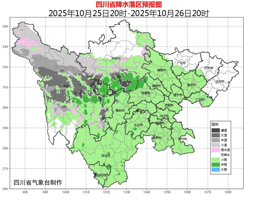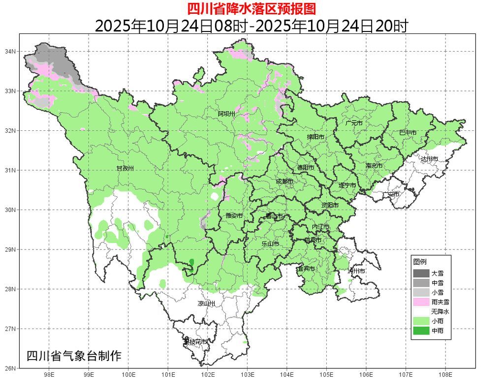 24日晚上到25日白天,盆地各市阴天有小雨,局部中雨;川西高原阴天间多云有阵雪(雨),局部中到大雪,个别暴雪;攀西地区阴天间多云有阵雨或小雨,局部中雨。