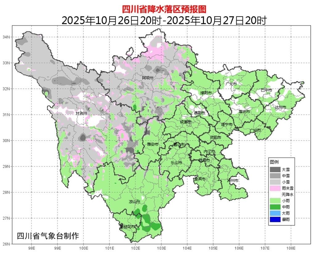26日晚上到27日白天,盆地大部阴天间多云有阵雨或小雨;川西高原大部阴天间多云有阵雪(雨),高海拔地区有中雪,个别大雪;攀西地区阴天有小雨,南部局地有中雨。