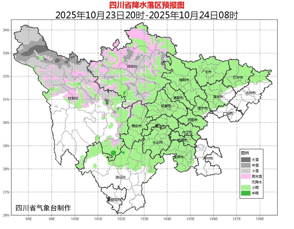 今天(10月23日)晚上,盆地大部阴天有小雨;甘孜州北部东部和阿坝州阴天间多云有阵雪(雨),局部中到大雪,甘孜州其余地方多云;攀西地区多云间阴,凉山州北部有阵雨。