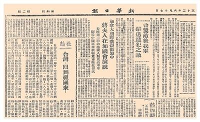 《新华日报》多次发表社论,呼吁台湾人民参加抗战、早日收复台湾。图为1943年6月17日《新华日报》社论《台湾,回到祖国来!》。中国人民抗日战争纪念馆供图