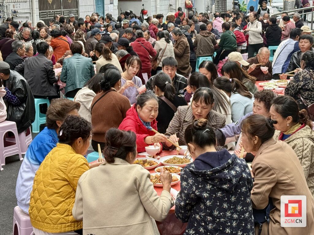 表演结束后,坝坝宴正式开席。社区工作人员与志愿者们忙着摆桌椅、分碗筷,将一道道热气腾腾的家常菜端上桌。老人们围坐在一起,一边品尝美食,一边拉着家常,畅谈社区变化与生活趣事,席间笑声不断,热闹又温馨,尽显“东街‘益’家人”的和睦氛围。