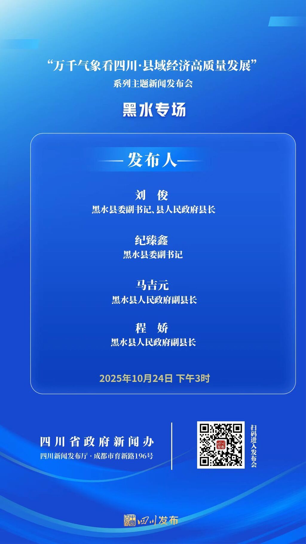 2025年10月24日(星期五)15:00,省政府新闻办将在四川新闻发布厅举行“万千气象看四川·县域经济高质量发展”系列主题新闻发布会黑水专场,黑水县委副书记、县人民政府县长刘俊围绕“生态引领、五维赋能描绘民族地区高质量发展绿色答卷”作介绍并答记者问,黑水县委副书记纪臻鑫,黑水县人民政府副县长马吉元、副县长程娇答记者问。四川发布客户端将全程图文直播,敬请关注!