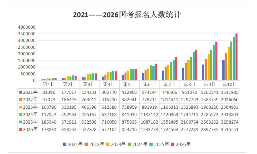 从近六年国考报考情况来看,2026国考报考人数在招录规模缩小的情况下依然创下历史新高,是2021年的2.3倍。