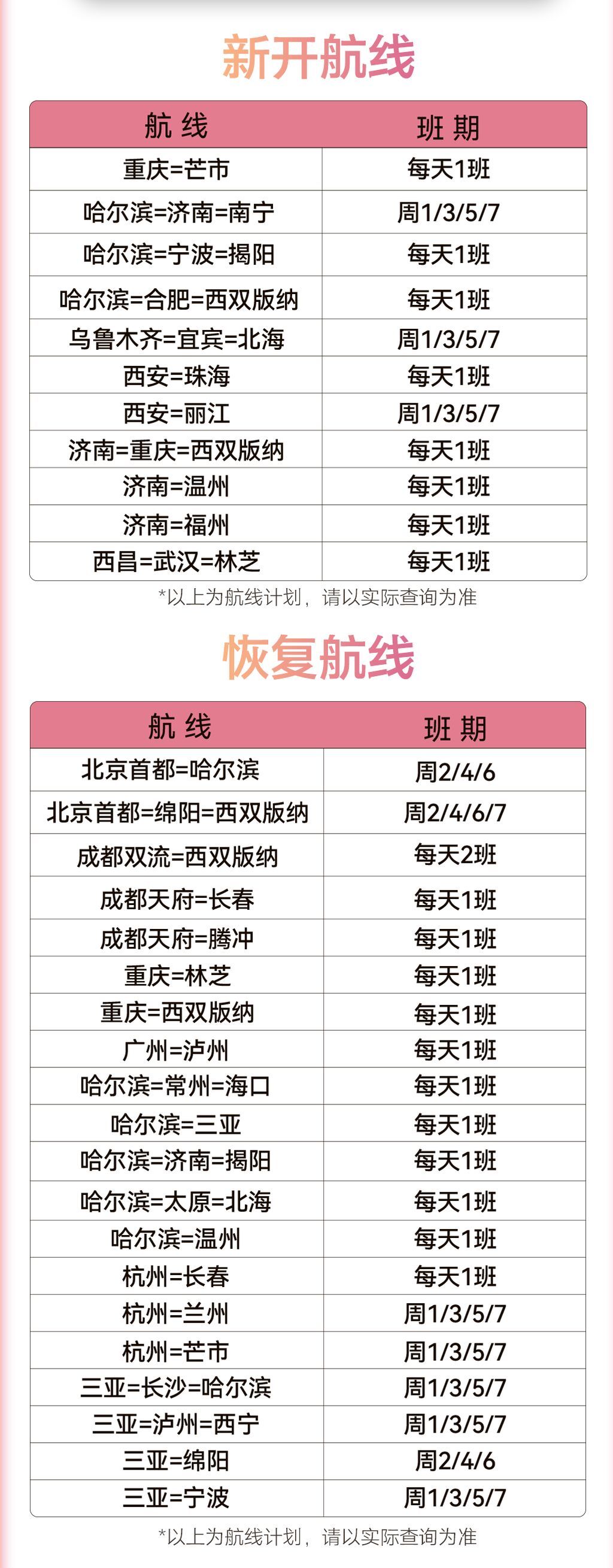 川航将在成都、重庆、北京、哈尔滨、济南、西安、杭州、三亚等城市新开、恢复30余条航线,丰富旅客出行选择。其中涉及四川的包括:新开西昌-武汉-林芝航线,每天一班;恢复北京首都-绵阳-西双版纳航线、成都双流-西双版纳航线、成都天府-长春航线、成都天府-腾冲航线。