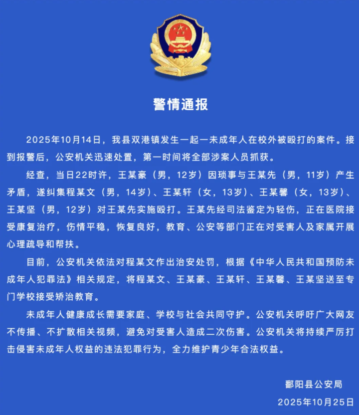 ·江西鄱阳警方:11岁男孩在校外遭多人殴打,全部涉案人员被抓获。