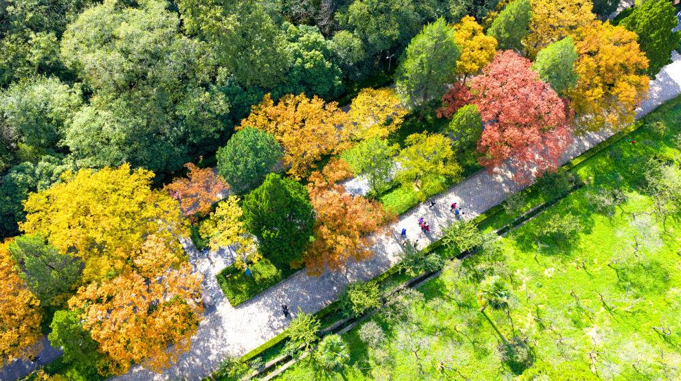 深秋时节,游人在南京明孝陵景区石象路上观赏秋景。