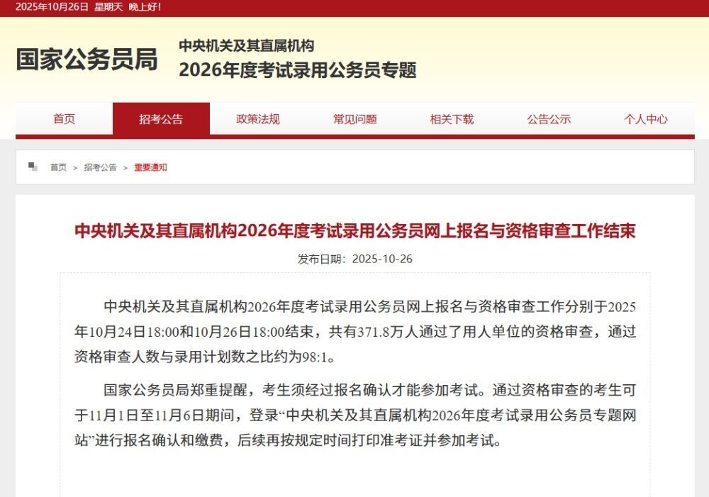 中央机关及其直属机构2026年度考试录用公务员网上报名与资格审查工作分别于2025年10月24日18:00和10月26日18:00结束,共有371.8万人通过了用人单位的资格审查,通过资格审查人数与录用计划数之比约为98:1。