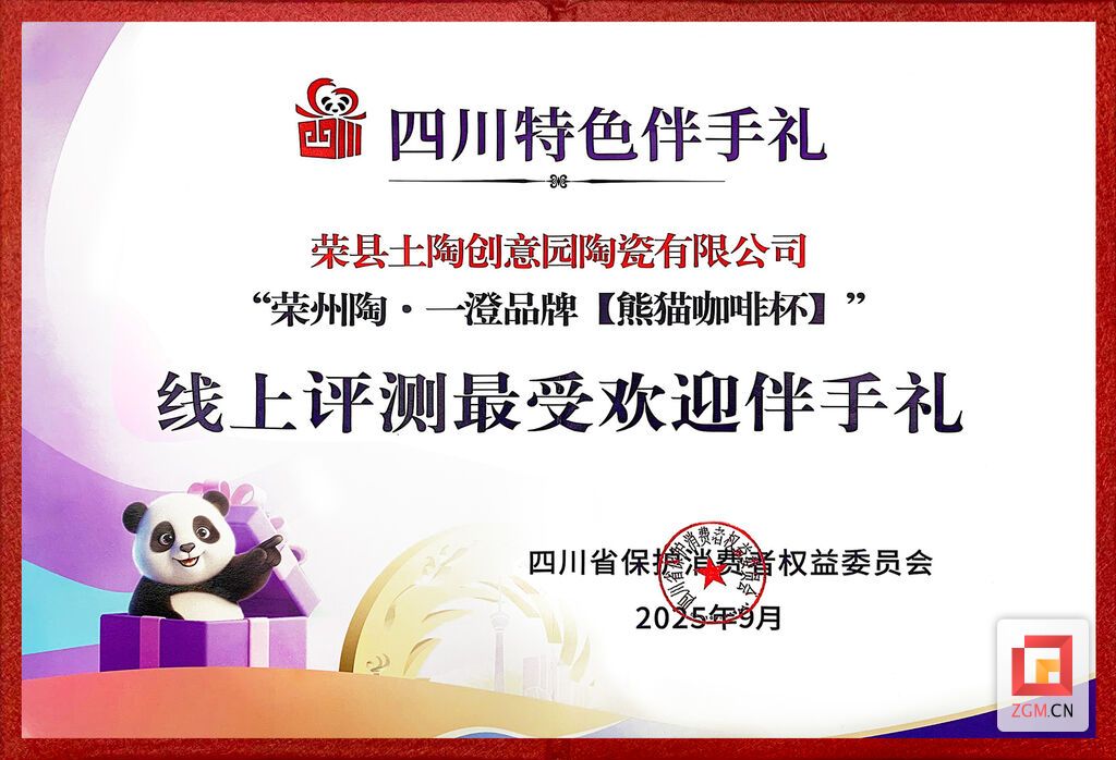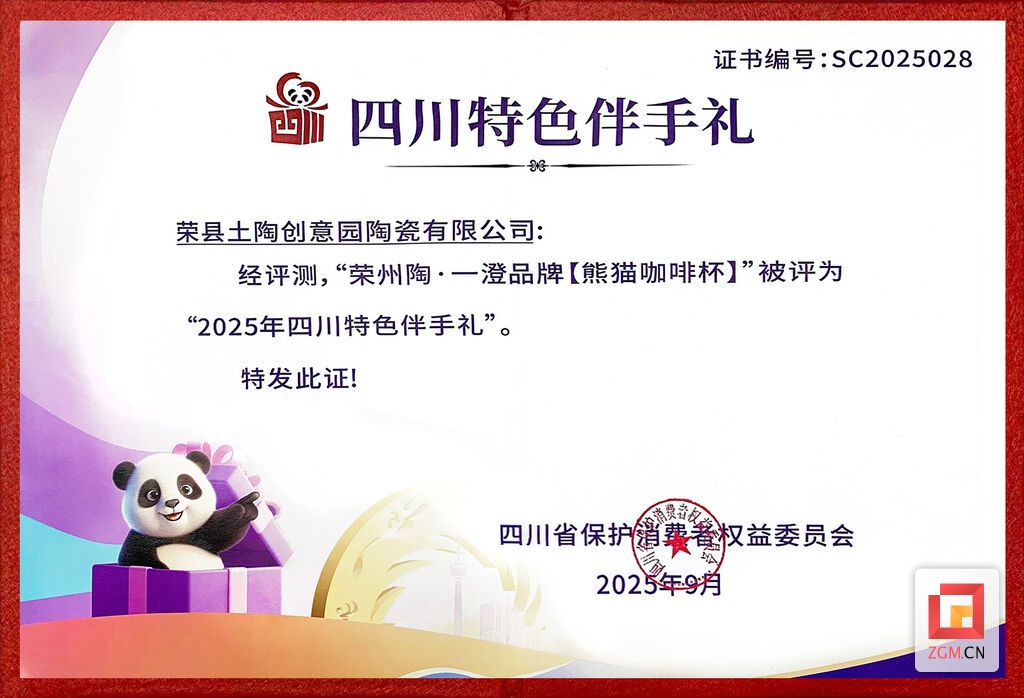 9月16日,四川省保护消费者权益委员会在成都举办第二届“礼遇四川”四川特色伴手礼线下评测活动。经过严格评审,50款产品凭借显著地域特色和丰富文化内涵脱颖而出,获评2025年“四川特色伴手礼”称号。荣州陶·一澄品牌“熊猫咖啡杯”获得“最受欢迎伴手礼”称号。