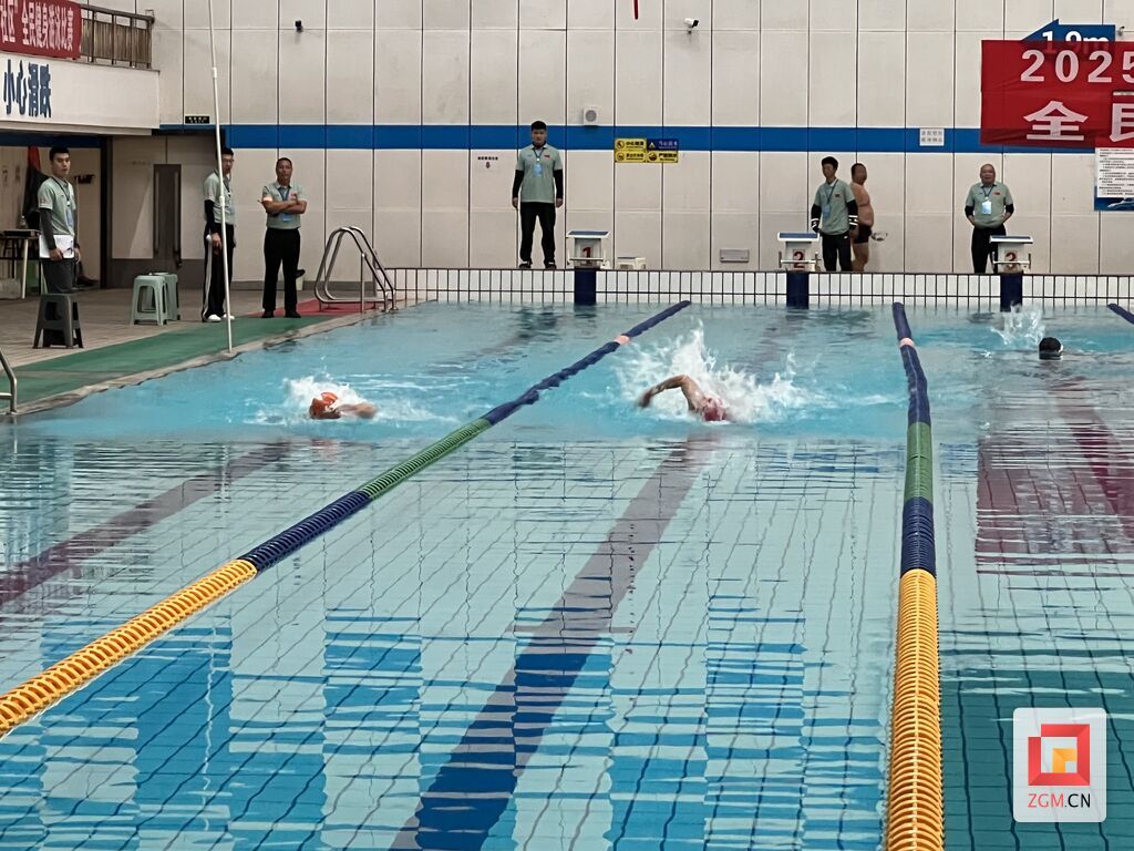 本次比赛在组别设置上覆盖广泛,设有青年组、中年组和老年组。竞赛项目不仅涵盖了传统的50米、100米、200米自由泳与蛙泳以及4×50米自由泳接力共七个竞技项目,还特别增设了具有实用技能导向的“抛绳救生”和“帆板划运接力赛”两项水上救援项目。在抛绳救生赛中,岸上队员精准投掷绳圈,水中队员默契配合,迅速被拖拽回岸,操作熟练,展现了过硬的水上安全救援能力。帆板划运接力则考验了选手的平衡掌控力与团队协作能力,成为赛场上一道别具特色的风景线。