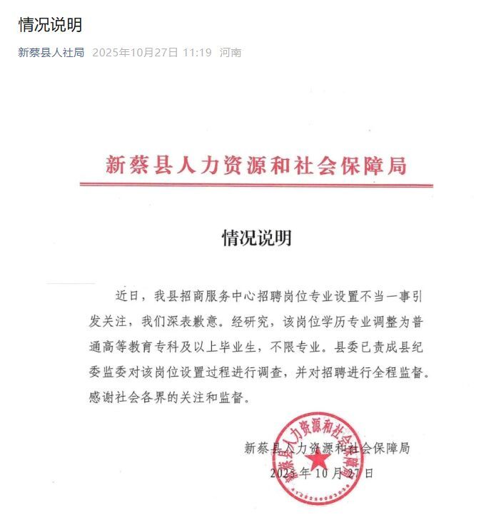 10月27日,河南新蔡县人社局发布情况说明。近日,河南新蔡县招商服务中心招聘岗位专业设置不当一事引发关注,我们深表歉意。经研究,该岗位学历专业调整为普通高等教育专科及以上毕业生,不限专业。县委已责成县纪委监委对该岗位设置过程进行调查,并对招聘进行全程监督。