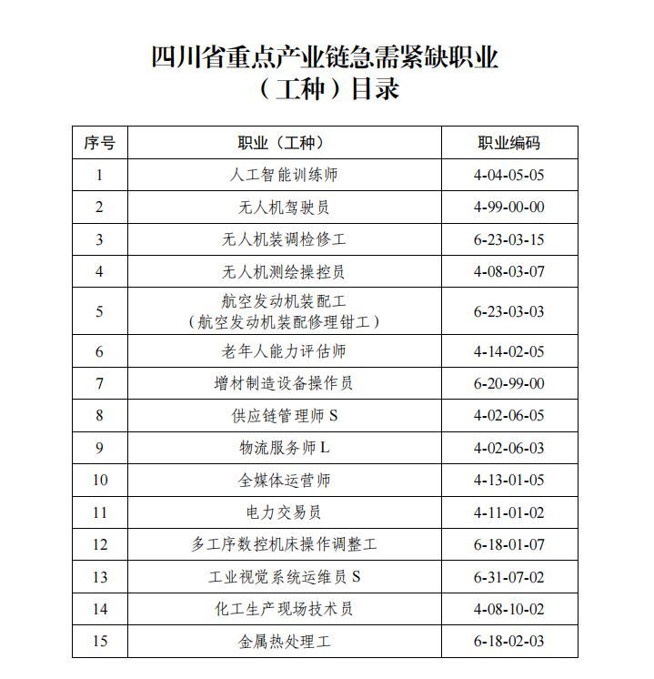 人工智能训练师、增材制造设备操作员、老年人能力评估师……近日,四川省人力资源和社会保障厅公布全省重点产业链急需紧缺职业(工种)目录。