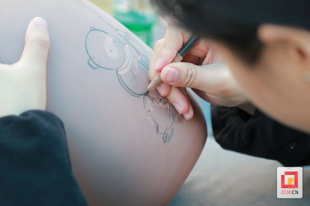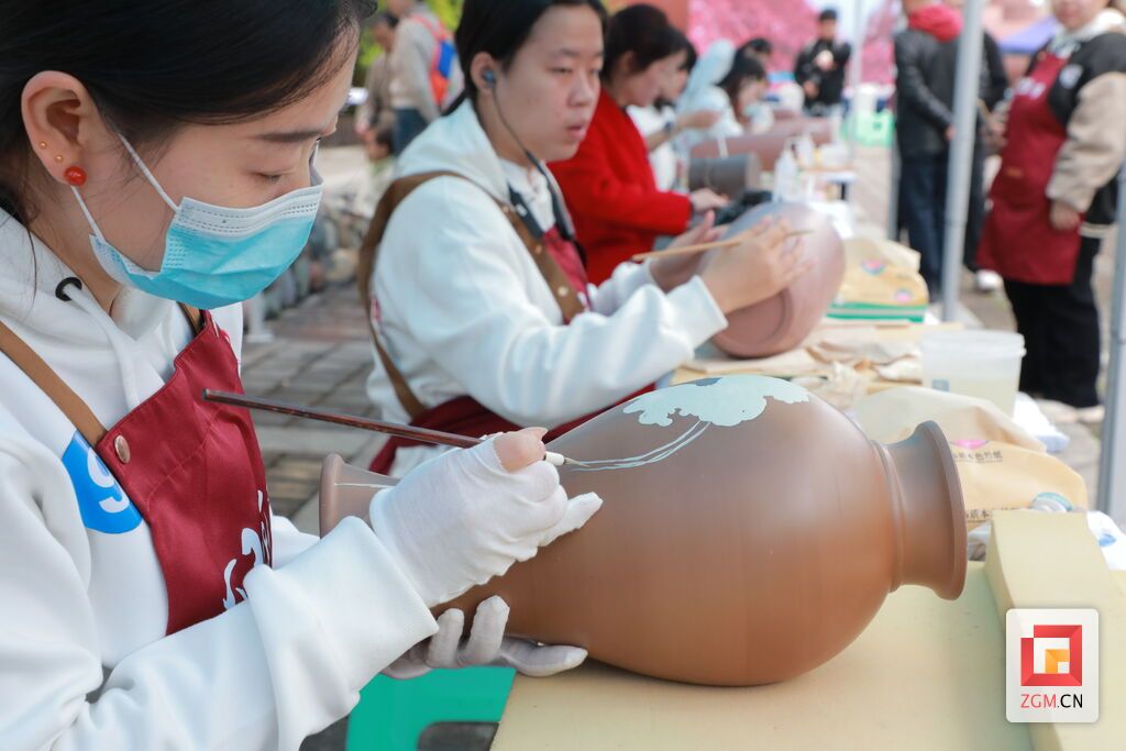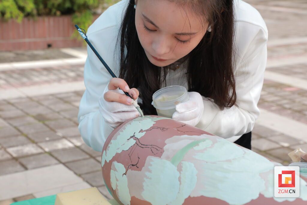 另一边的工艺制作组则是“静中见功夫”,选手们紧盯作品,刻刀细琢纹路、毛笔勾勒图案、陶拍校准坯体,每一个动作都精准利落,在安静中较着“手艺高下”。