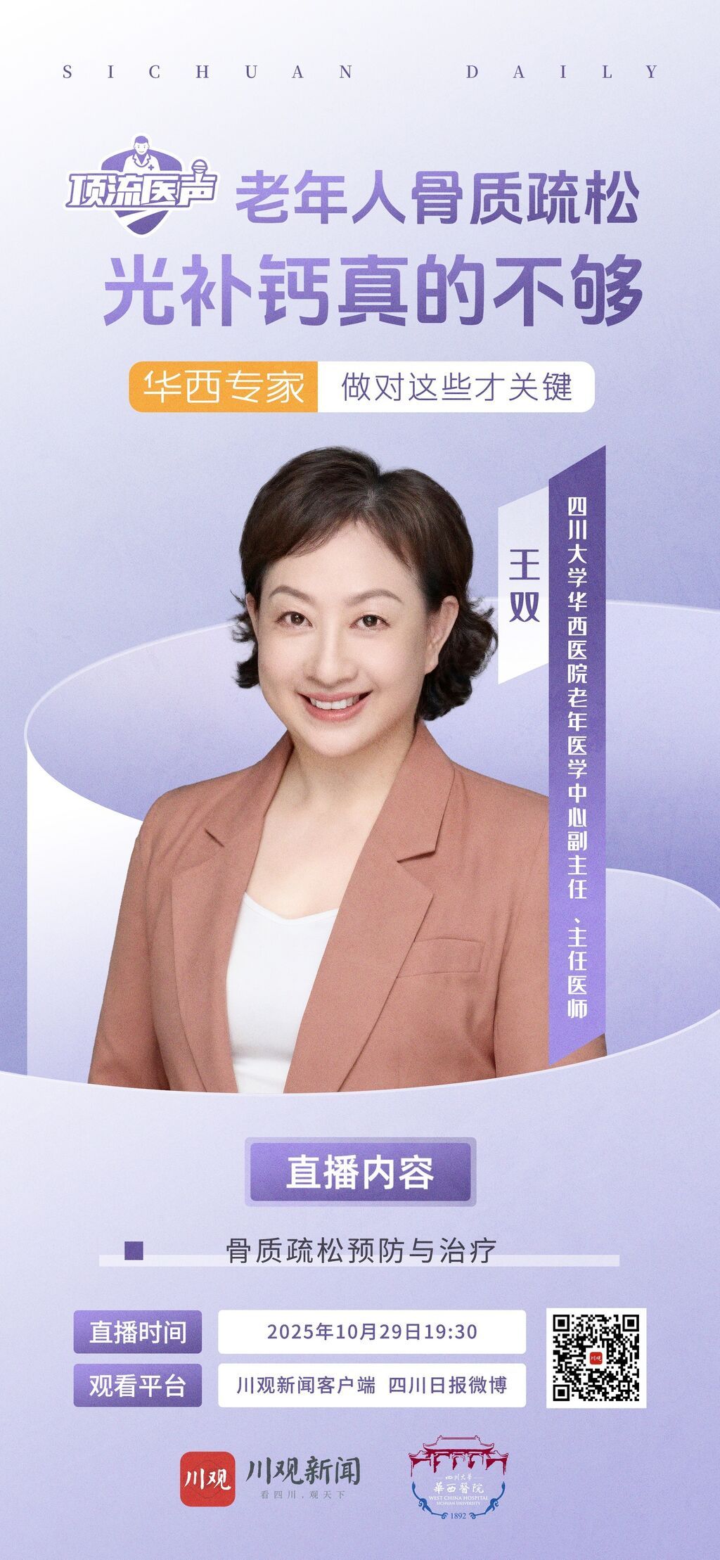 10月29日,川观新闻“顶流医声”科普直播邀请四川大学华西医院老年医学中心副主任王双教授,详解骨质疏松的防治之道,助力老年人健康“骨”劲。