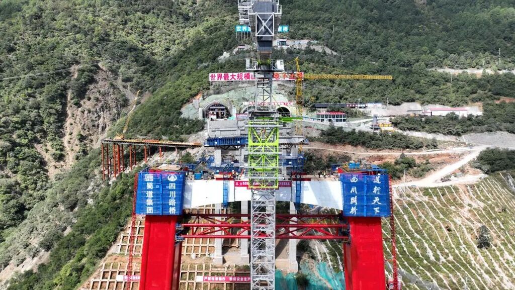 10月27日,在世界第一山区悬索桥——西香高速泸沽湖特大桥的建设现场,两岸工程节点“双喜临门”,香格里拉岸下横梁完成外科手术刀式精准吊装,西昌岸索塔高度突破百米大关,这座承载多项“世界之最”的超级工程在同一天实现“毫米级合龙”与“塔破百米”两大关键进展,标志着大桥建设进入全面提速阶段。