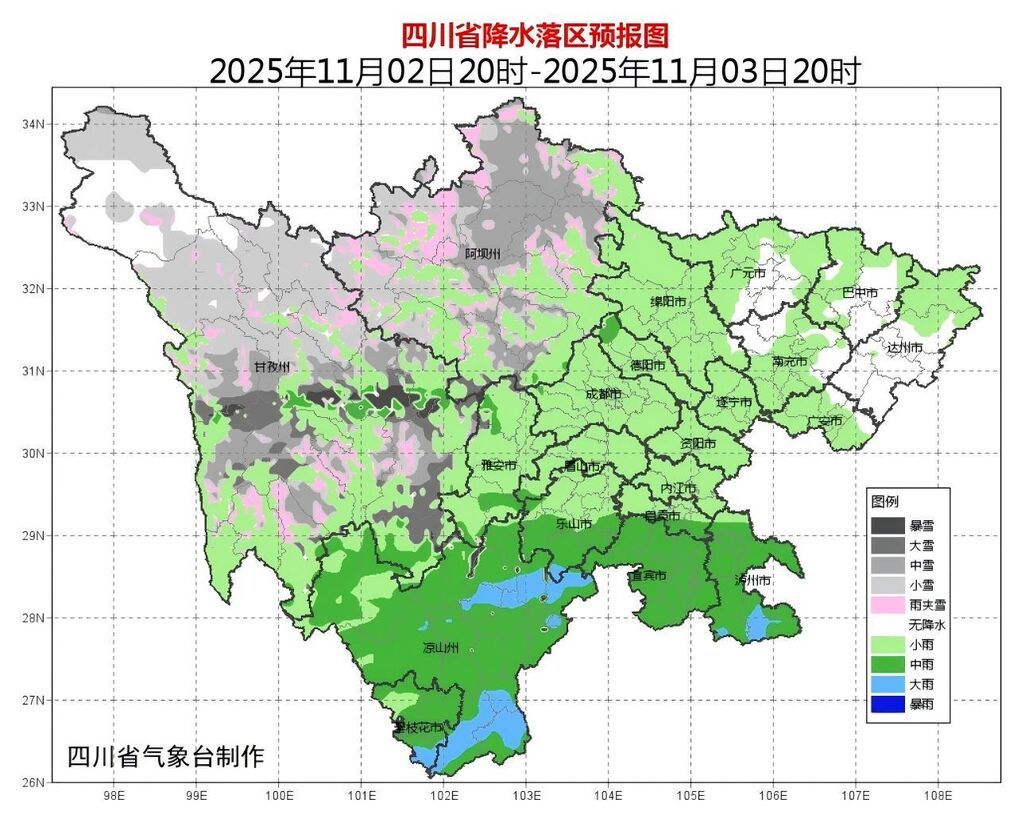 11月2日晚上到3日白天,盆地大部阴天有小雨,南部中雨,个别地方大雨;川西高原阴天有阵雨(雪),局地有中雪(雨)到大雪;攀西地区阴天有小到中雨,局部大雨。