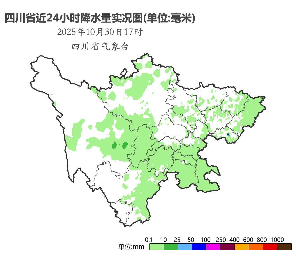 10月31日晚上到11月1日白天,盆地大部阴天有阵雨或小雨,中部、西南部有中雨;川西高原阴天有阵雨(雪),部分地方有中到大雨(雪),局地暴雪(雨);攀西地区阴天有小到中雨,局地大雨。