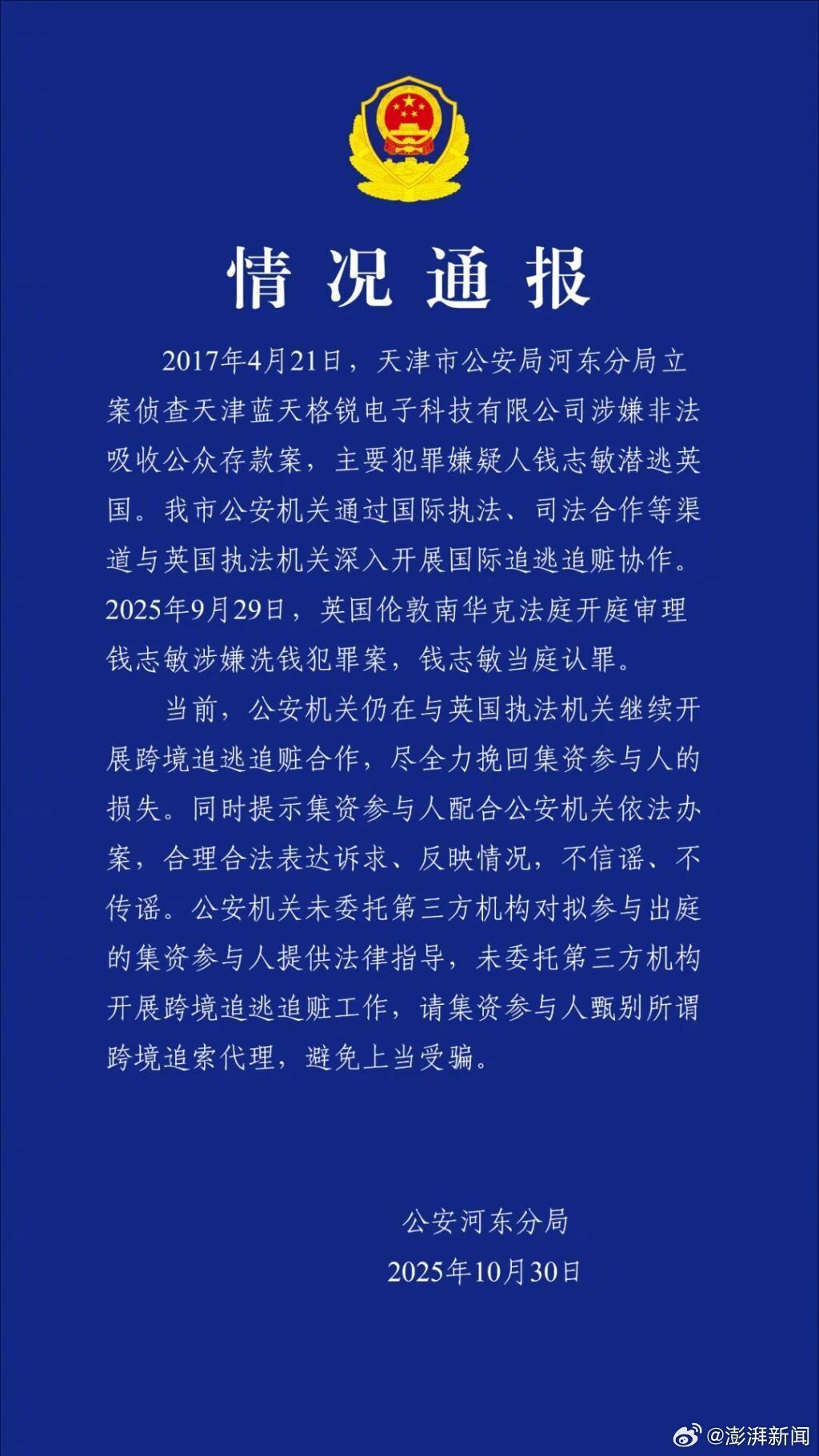 ·钱志敏在英当庭认罪承认洗钱,天津警方通报:继续开展跨境追逃追赃。