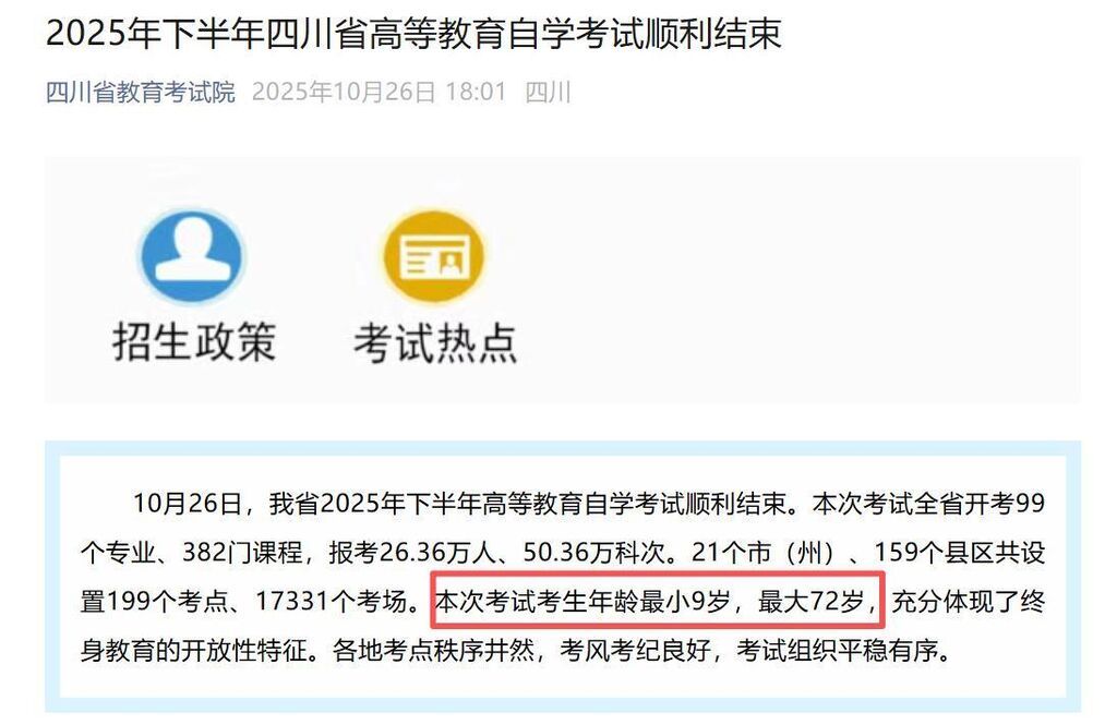 ·四川一9岁小朋友参加高等教育自学考试,四川省教育考试院称自考无年龄限制,当地助学机构:属特殊情况。