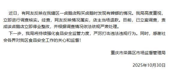 ·网友在荣昌买卤鹅发现蟑螂在爬,当地市场监督管理局通报:立案调查、店铺停业整改。
