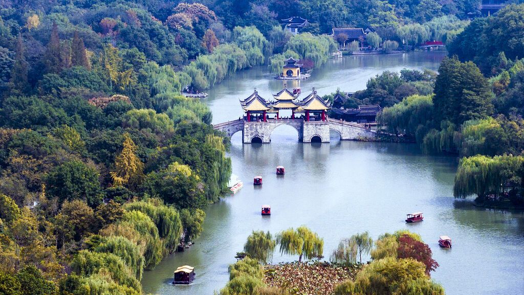 10月30日,扬州瘦西湖风景区层林尽染、五彩斑斓,尽显湖上园林诗意秋色。