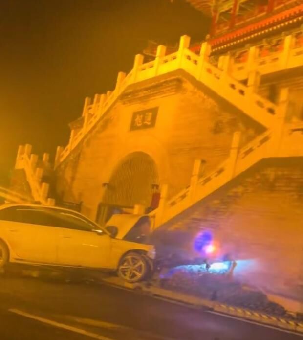 ·轿车凌晨撞上西安鄠邑钟楼基座,文管所称楼梯和下方墙面受损,交警:无伤亡,案件正在办理。
