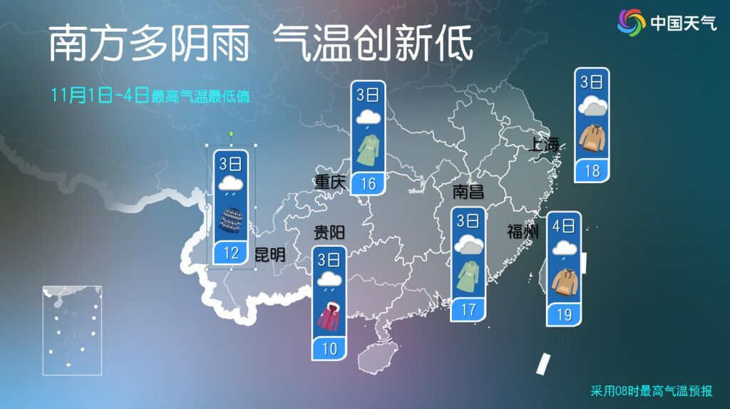 而南方地区下周前期将先经历阴雨带来的湿冷,多地最高气温将创立秋来新低。