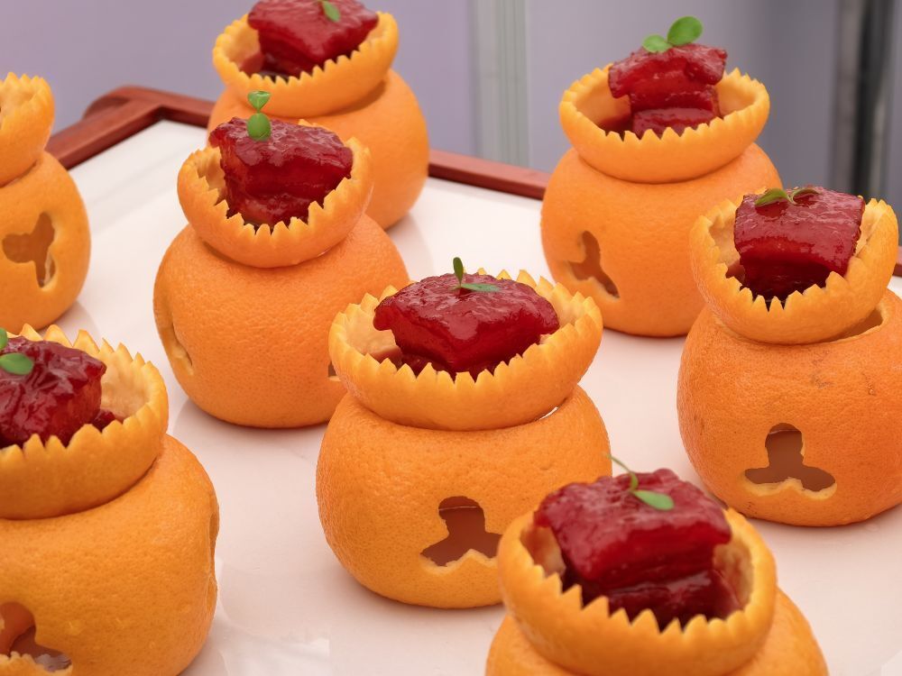 11月1日,第八届世界川菜大会在四川乐山举行。在2025世界川菜烹饪技能大赛现场,“橙香方肉”新鲜出炉。新华社记者边思琪 摄