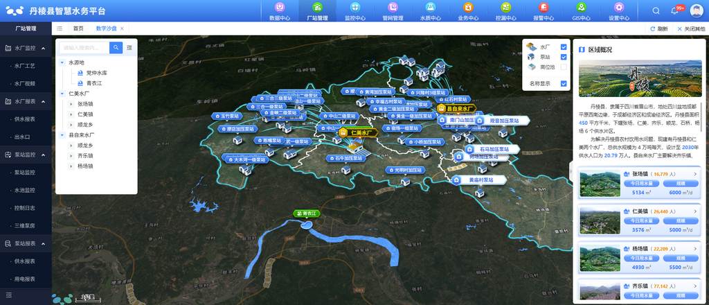 曾经,丹棱县农村供水长期面临“夏季用水紧张、管网漏损难控、应急响应迟缓、服务体验不佳”等现实难题。基于此,2023年9月至2024年4月,丹棱县投资700余万元(其中数字孪生专项建设约400万元),聚焦全县农村供水痛点问题,启动农村供水信息化智能化项目建设,搭建丹棱县全域智慧农村供水云平台,制定并实现“12345”的建设目标(建设一套系统,实现全面监管;串联两座水厂,承载民生需求;实现三化协同,提升服务质量;增强四预共建,保障供水安全;实现五域共治,共谱水利新章)。