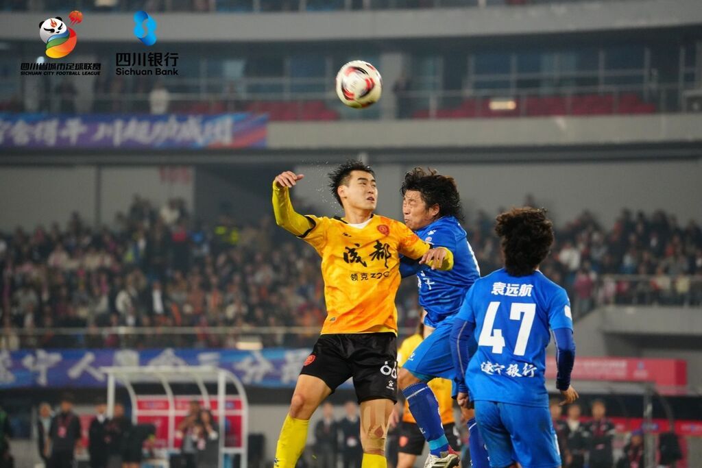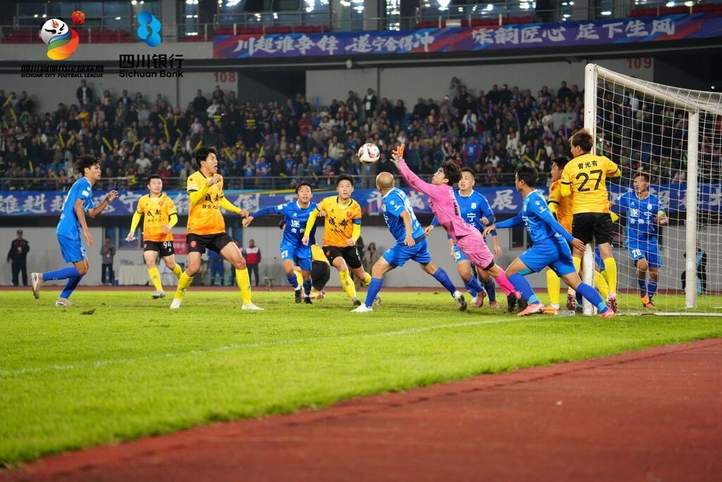 相较于首战的紧张无序,此役遂宁队脱胎换骨,用身体筑起坚固防线,用拼搏诠释城市精神。追不上的球,就奋力倒地铲抢;断不下的球,就用身体硬挡;带球技术不及对手,就果断开大脚破坏;身体素质处于下风,就默契地多人包夹。特别是比赛40分钟,成都队右翼发起猛攻,遂宁队两名球员先后飞铲拦截无果,眼看射门近在咫尺,回防的中场球员毅然用身体挡下足球,而门将也早已做出扑救动作——四人联动的画面,正是“舍得干”最鲜活的注脚。