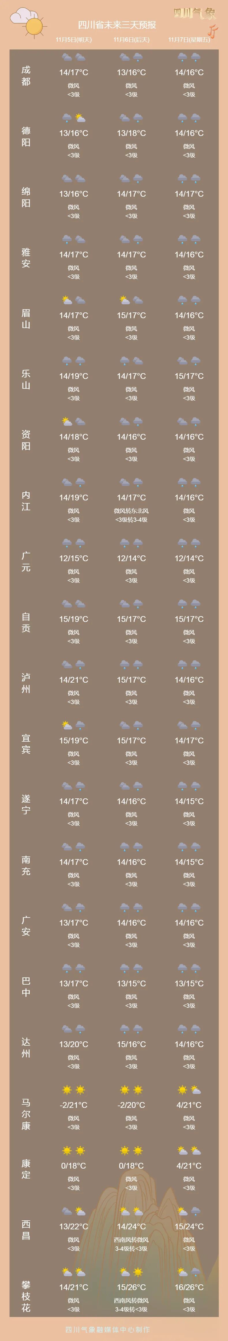 四川省气象台预计,未来三天,盆地以阴天间多云天气为主,多分散小雨;攀西地区大部地方多云,川西高原大部晴到多云。