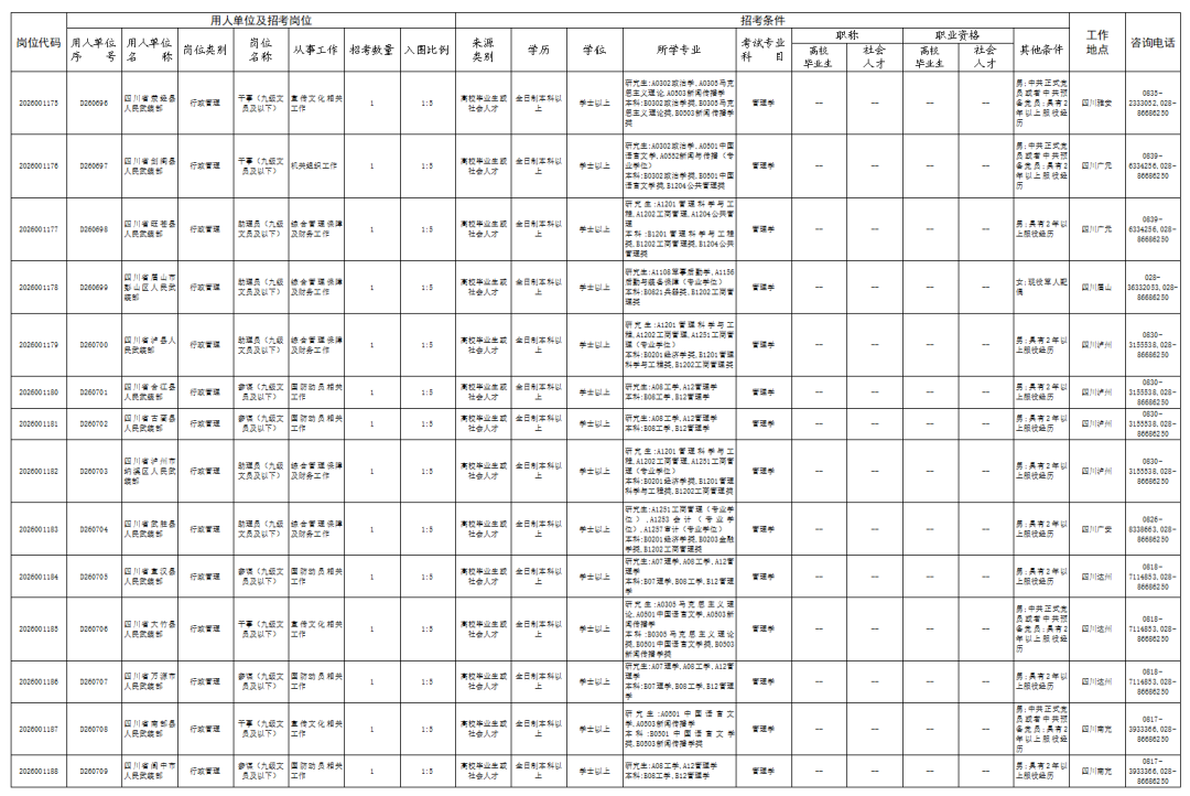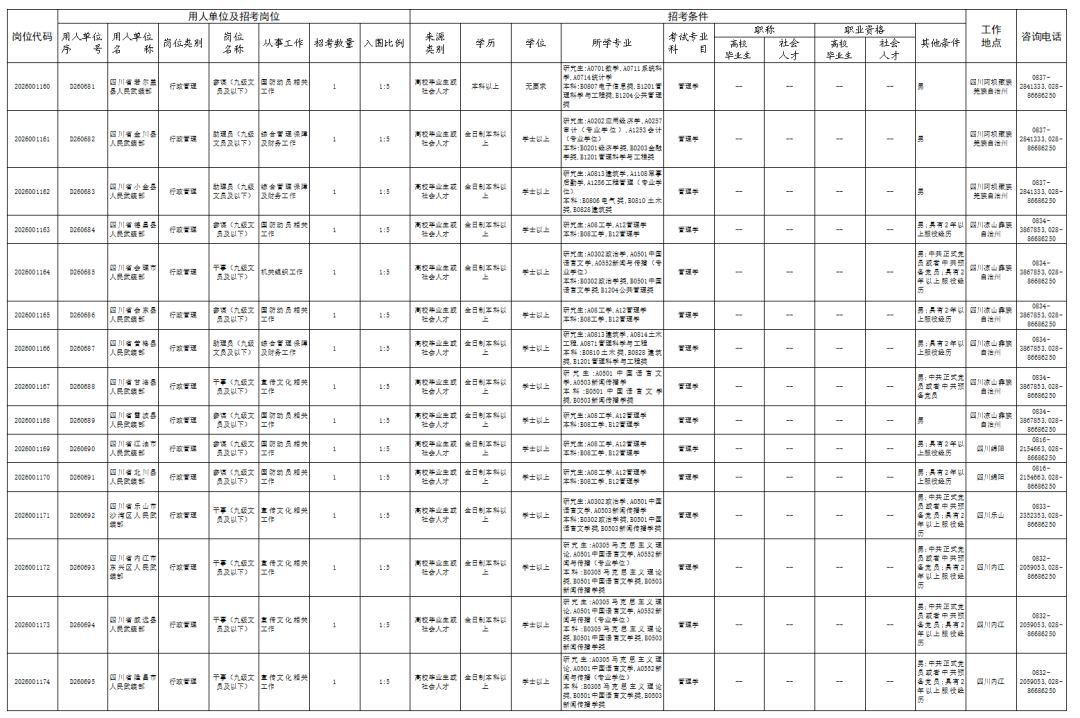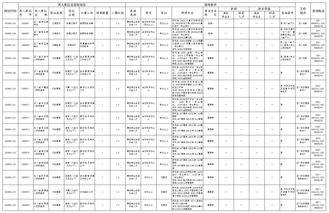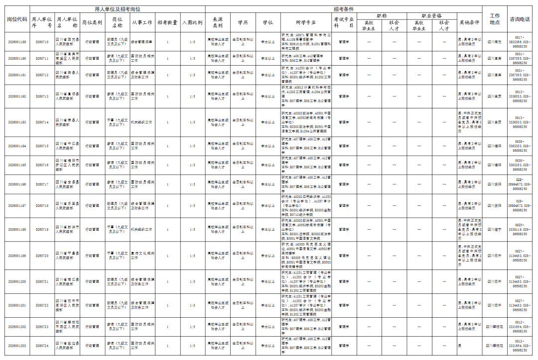 四川省军区2026年面向社会公开招考59名文职人员,包括参谋、干事、助理员、助理工程师、助理讲师。附招考岗位计划。考生可于2025年11月3日8:00至11月9日18:00期间,登录军队人才网(网址:http://www.81rc.mil.cn或者http://81rc.81.cn)进行网上报名。全军统一笔试拟于2025年12月14日在全国各直辖市、省会城市、自治区首府和其他部分城市同时举行。根据计划安排,2026年5月起展开审批录用工作。