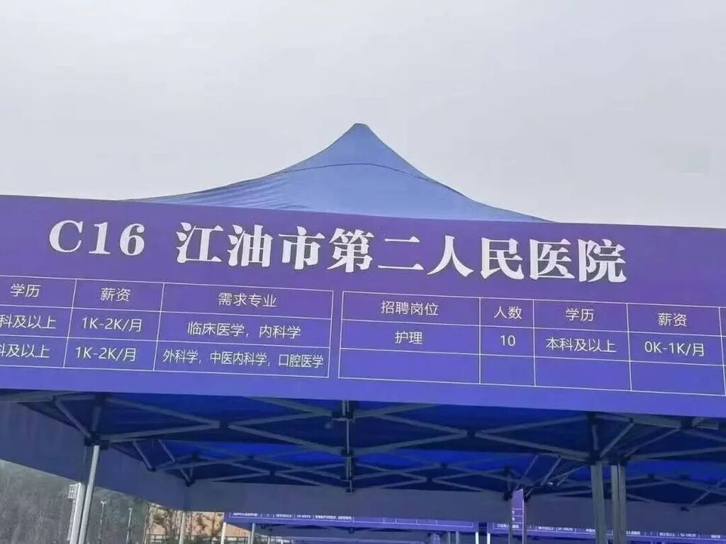 11月3日,在川北医学院2026届毕业生秋季双选会上,四川江油市第二人民医院一则招聘信息将“护理”岗位的月薪标注为“0k-1k/月”,引发热议。