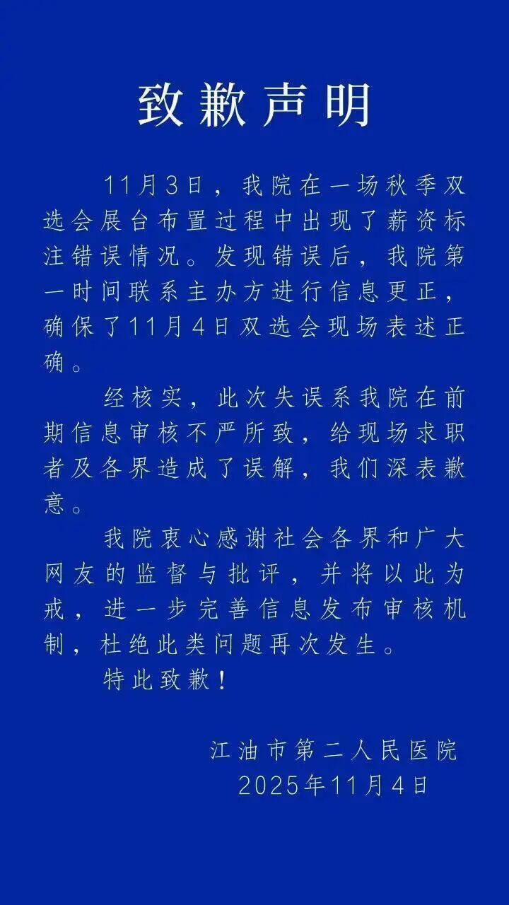 11月4日晚,江油市第二人民医院发布致歉声明称,11月3日,该院在一场秋季双选会展台布置过程中出现了薪资标注错误情况。
