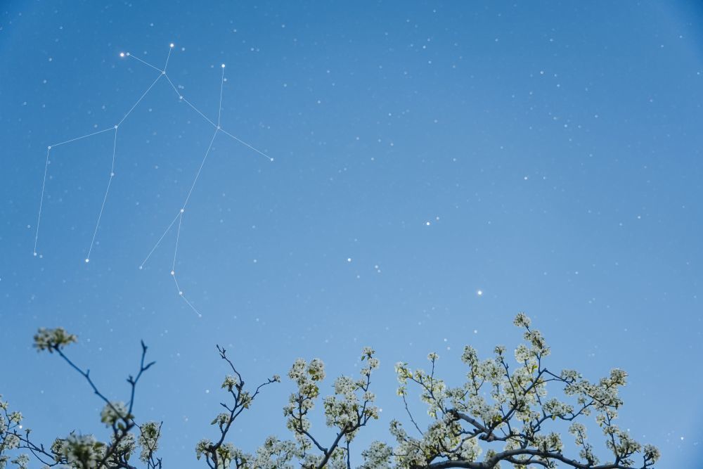 2025年4月2日,在北京市房山区琉璃河镇贾河村拍摄的梨花和双子座。(王俊峰 摄)