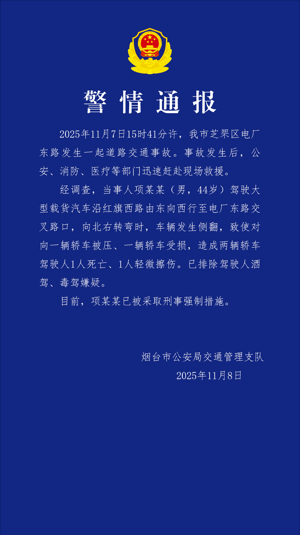 ·烟台警方通报一起货车侧翻事故:两轿车司机1死1伤。