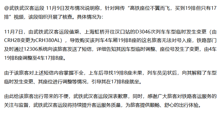 ·高铁票买到19排但车厢只有17排?官方发布情况说明。