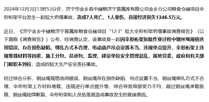 ·中储粮济宁直属库致7死事故调查报告公布,12人已被采取强制措施。