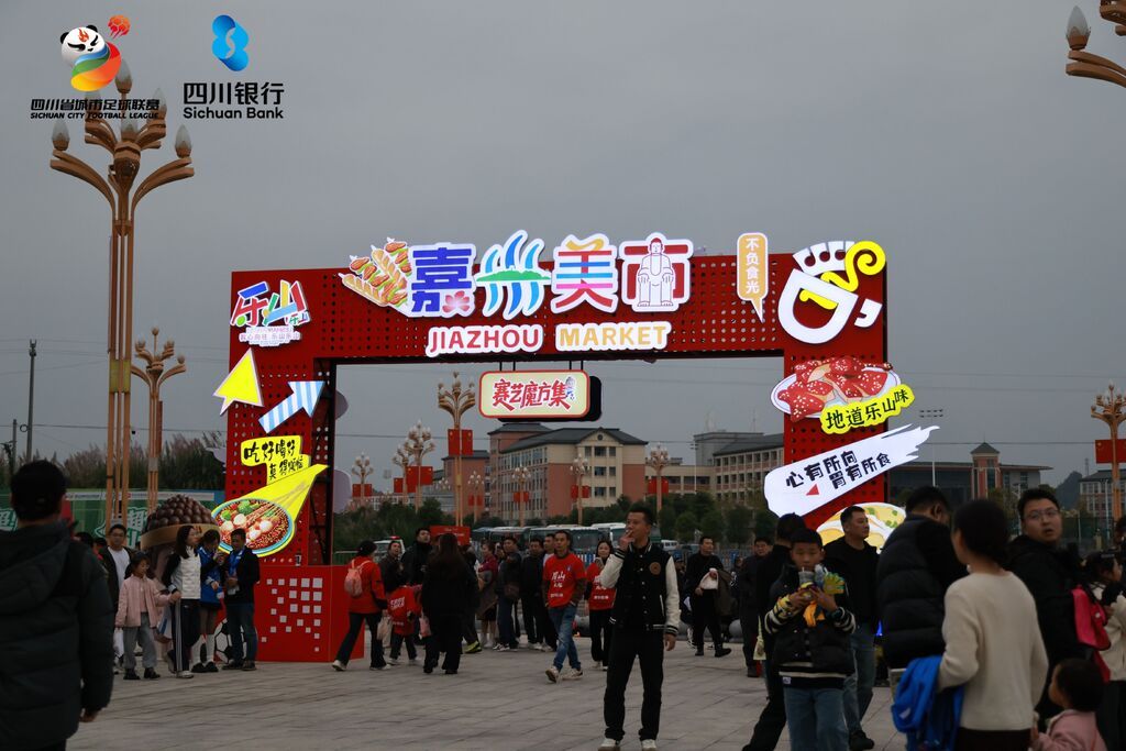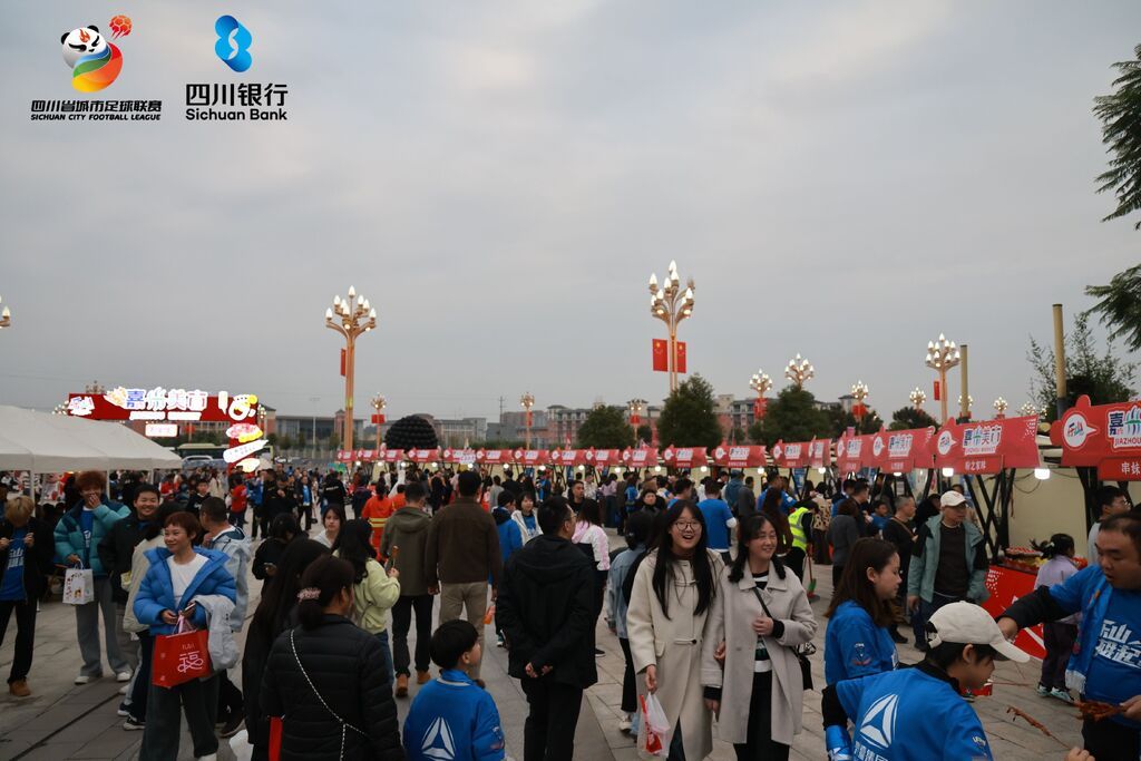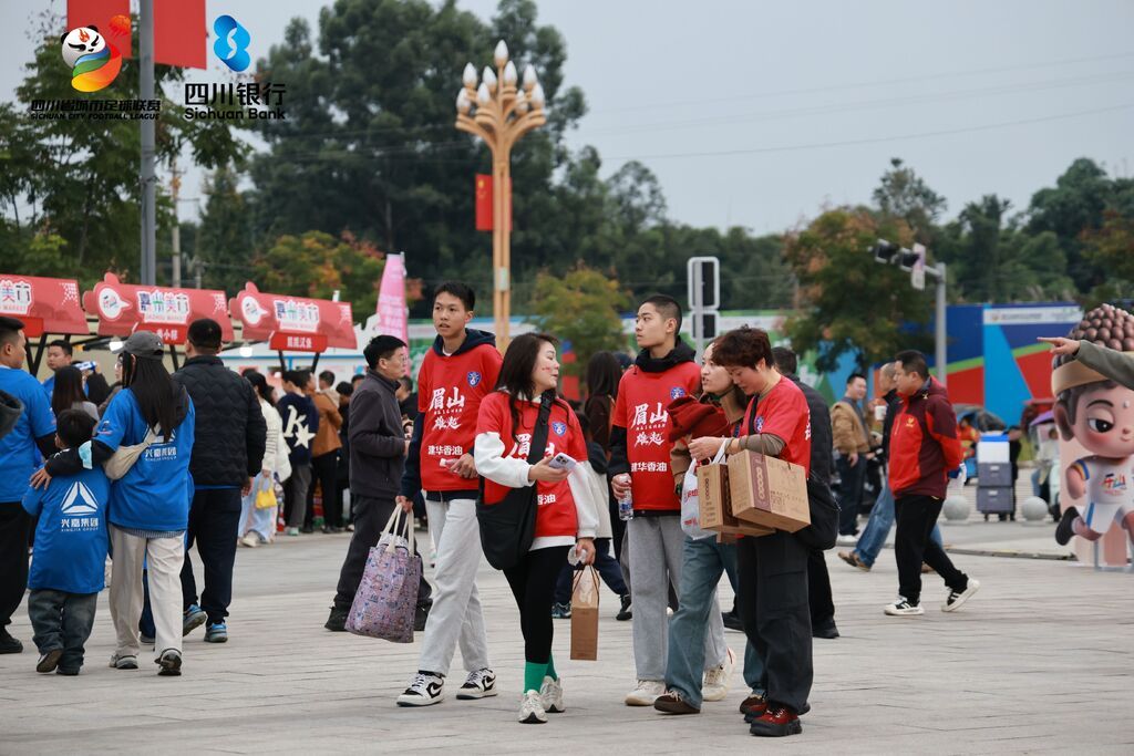 在乐山市奥体中心,场内哨声激荡、人声鼎沸,场外则是另一番火热景象。以各区县轮流承办的主题文旅集市依次铺开,甜皮鸭、炸串、麻辣烫等地道美食香气四溢,宛如一张丰富的“菜单”,吸引球迷从四面八方涌来。一位在乐山读书的泸州学生表示,集市“便宜优惠,吃的很多”,对学生群体非常友好。据乐山市商务局统计,“川超”乐山主场期间直接拉动消费增长超10%。
