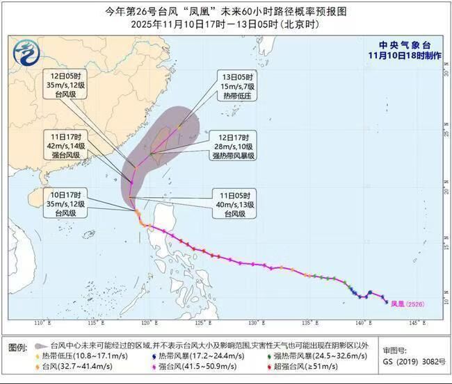 今年第26号台风“凤凰”的中心今天(10日)下午5点钟位于台湾岛鹅銮鼻南偏西方约500公里的南海中东部海面上,就是北纬17.9度、东经118.7度,中心附近最大风力有12级(35米/秒),中心最低气压为970百帕,七级风圈半径380-480公里,十级风圈半径180-220公里,十二级风圈半径80公里。