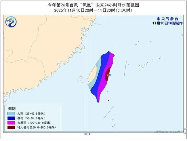 降水预报:10日20时到11日20时,台湾岛大部将有大到暴雨,其中东部部分地区有大暴雨到特大暴雨(250-280毫米)。