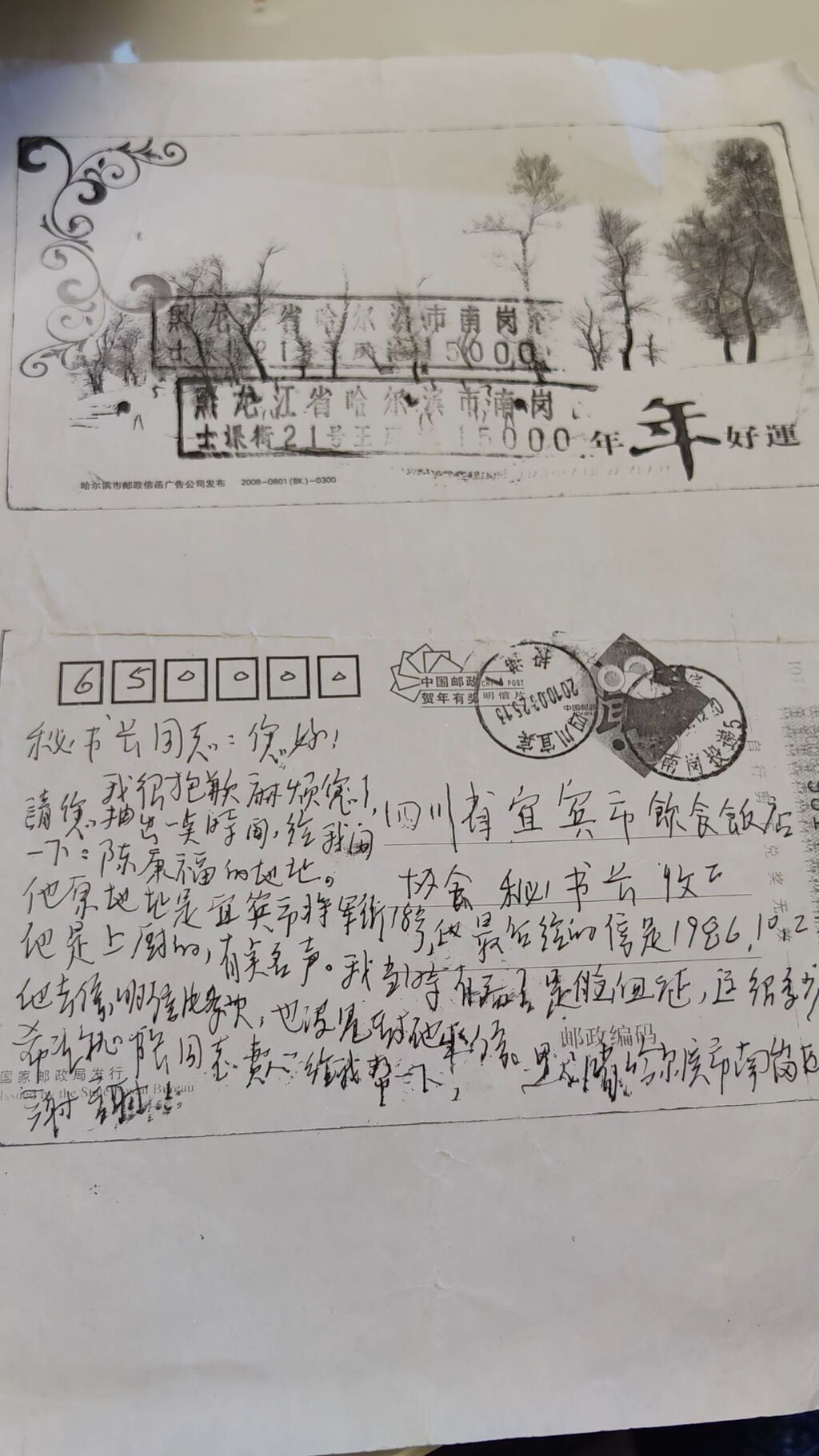 那是一张从黑龙江省哈尔滨市寄到