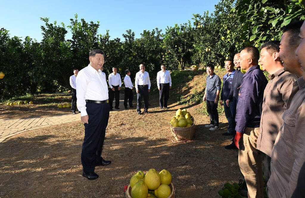 立冬时节,正是柚子成熟期。金灿灿的柚子压弯了枝头。总书记沿着果林小道边走边看,观长势、话树龄、问收成。林子深处,他遇到一群果农。