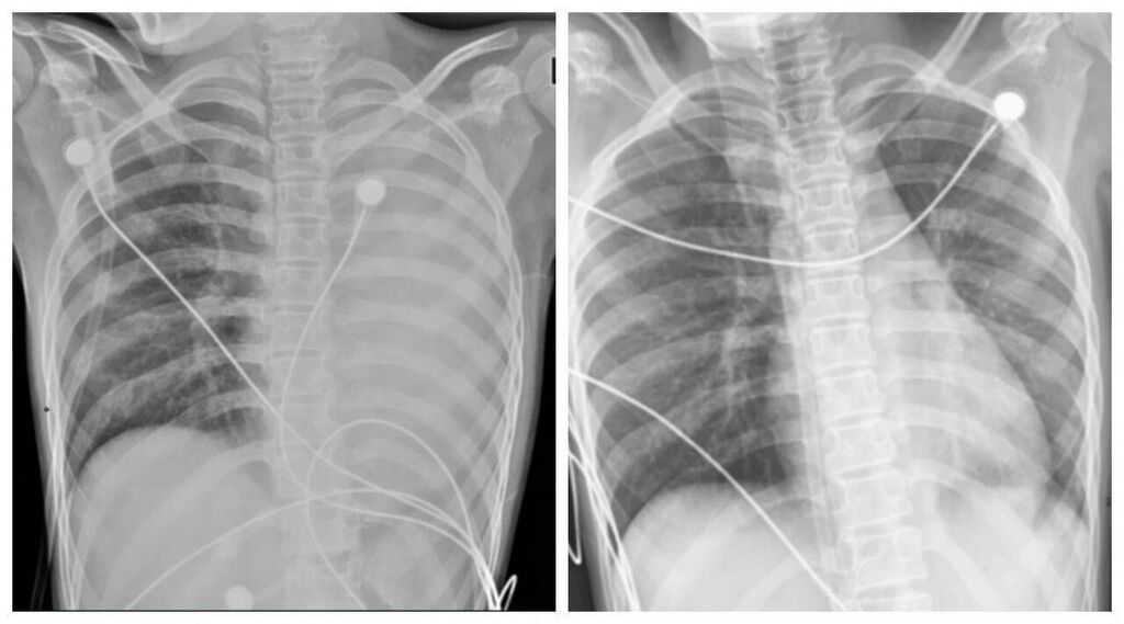 一开始,她只是轻微咳嗽,发热后在外院检查提示肺炎、肺不张,转诊到浙大四院儿科时,笑笑出现呼吸急促、胸闷胸痛,血氧饱和度勉强维持在90%左右,胸片显示左肺已完全呈“白肺”改变,病情急剧恶化。