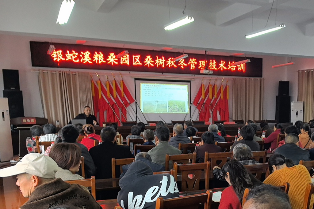 11月10日,富顺县农业农村局蚕桑中心联合自贡市卫生康复学院药品食品学院,在飞龙镇举办富顺县银蛇溪粮桑现代农业园区2025年秋冬桑树管理技术培训会。相关乡镇农技人员、小蚕共育室负责人、养蚕村产业专干和蚕桑新型经营主体代表共120余人参加。
