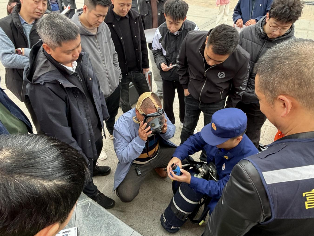 “这个报警声是什么意思?”“安全带怎么穿才最保险?”“通风到底要多久?”……面对实际操作中容易遇到的问题,县消防救援大队讲解员通过“步骤分解+实操演示+人人过关”的方式,围绕有限空间作业前的气体检测、通风、审批流程,以及作业过程中必需的正压式空气呼吸器、全身式安全带等关键救援防护设备的维护使用进行详细教学。参训人员轮番上阵,从气体检测到设备佩戴,每一个环节都亲手操作,确保在突发状况下能迅速、正确地使用这些“保命设备”。