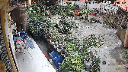 一头野生亚洲象用鼻子撞开铁门进到农户家中